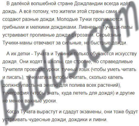 Придумай и запиши маленькую сказку о героях, которые живут в волшебной стране. В этой стране всё время идёт дождь. Какие герои могут там жить?