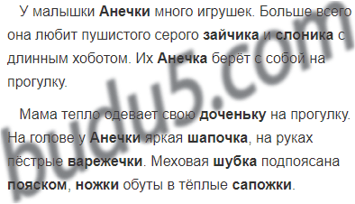 Мама тепло одевает свою ... на прогулку. На голове у ... яркая ..., на руках пёстрые ... Меховая ... подпоясана ..., ... обуты в тёплые ...
