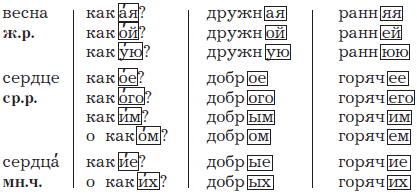 Прочитай. Поставь ударение в именах прилагательных. Сравни окончания слов-вопросов и имён прилагательных. Что ты заметил? Попробуй сформулировать правило.