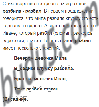Письмо по памяти. Прочитай стихотворение Олега Григорьева. Оно построено на игре слов. Какими словами играет поэт? О ком говорится в первом предложении? Что говорится? А во втором? Одно или несколько значений у глагола разбить? В каком времени употреблён этот глагол в тексте? Как ты определил? Подчеркни простым карандашом все знакомые орфограммы. Объясни написание.