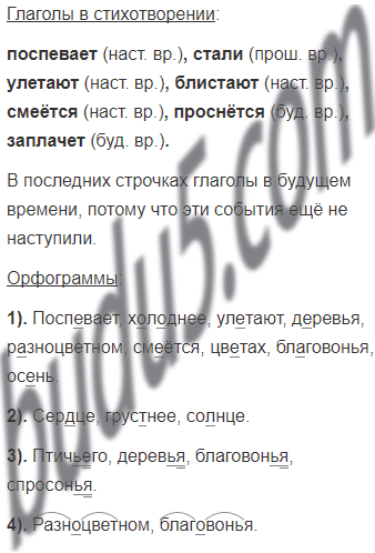 Как ты думаешь, почему все глаголы в настоящем времени, а в двух последних строчках – в будущем? Выпиши слова, в которых есть такие орфограммы: 1) буквы безударных гласных в корне; 2) буквы непроизносимых согласных в корне; 3) разделительный ь; 4) соединительные буквы о-е в сложных словах. Обозначь эти орфограммы.