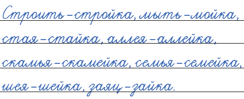 Лить - ... , строить - ... , мыть - ... , стая - ... , аллея - ... , скамья - ... , семья - ... , шея - ... , заяц - ... .
