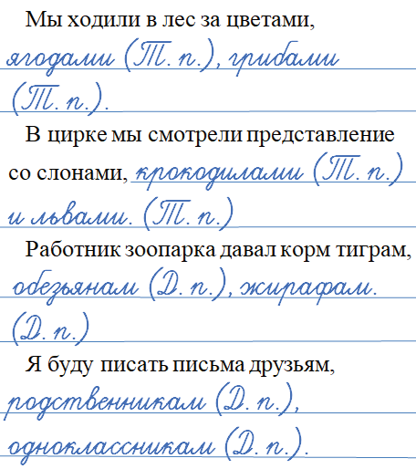 Вспомните, в каком падеже имена существительные во множественном числе имеют окончания -ам или -ям, а в каком - -ами или -ями. Дополните предложения своими словами. В скобках укажите падеж каждого подобранного существительного.
