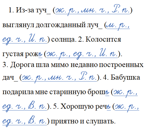 1. Из-за туч_ (ж. р., мн. ч., Р. п.) выглянул долго-жданный луч_ (м. р., ед. ч., И. п.) солнца. 2. Колосится густая рожь (ж. р., ед. ч., И. п.). 3. Дорога шла мимо недавно построенных дач_ (ж. р., мн. ч., Р. п.). 4. Бабуш-ка подарила мне старинную брошь (ж. р., ед. ч., В. п.). 5. Хорошую речь (ж. р., ед. ч., В. п.) приятно и слушать.