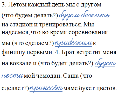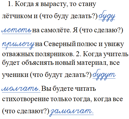 1. Когда я вырасту, то стану лётчиком и (что буду делать?) буду лететь на самолёте. Я (что сделаю?) прилечу на Северный полюс и увижу отважных полярников. 2. Когда учитель будет объяснять новый материал, все ученики (что будут делать?) будут молчать. Вы будете читать стихотворение только тогда, когда все (что сделают?) замолчат.3. Летом каждый день мы с другом (что будем делать?) будем бежать на стадион и тренироваться. Мы надеемся, что во время соревнования мы (что сделаем?) прибежим к финишу первыми. 4. Брат встретит меня на вокзале и (что будет делать?) будет нести мой чемодан. Саша (что сделает?) принесёт маме букет цветов.