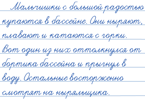 Ребята купаются в бассейне. Они плавают и ныряют в тёплой воде. Один мальчик умело прыгает в воду с бортика. В бассейн ведёт горка, и ребята с неё катаются. Дети соревнуются в плавании и умении задерживать дыхание под водой. Они радуются интересному дню.