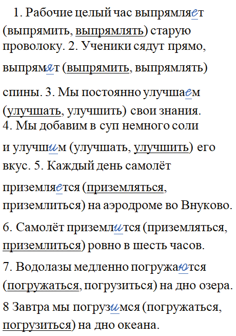 1. Рабочие целый час выпрямля _т (выпрямить, выпрямлять) старую проволоку. 2. Ученики сядут прямо, выпрям т (выпрямить, выпрямлять) спины 3. Мы постоянно улучша_м (улучшать, улучшить) свои знания. 4. Мы добавим в суп немного соли и улучш_м (улучшать, улучшить) его вкус. 5. Каждый день самолёт приземли тся (приземляться, приземлиться) на аэродроме во Внуково. 6. Самолёт приземл тся (приземляться, приземлиться) ровно в шесть часов, 7. Водолазы медленно погружа тся (погружаться, погрузиться) на дно озера. 8 Завтра мы погруз мся (погружаться, погрузиться) на дно океана.