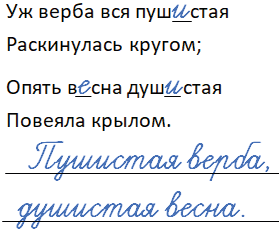 О вербе автор пишет, что она пушистая и раскинулась кругом, а о весне, что она душистая и уже наступила ("повеяла крылом").