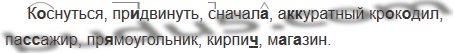 К..снуться, продвинуть, сначал.., а(к, кк)уратный кр..к..дил, па(с, сс)ажир, пр..моугольник, кирпич(?), м..г..зин.