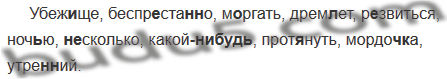 Убеж..ще, беспр..ста(н, нн)о, м..ргать, дрем(?)ет, р..звиться, ноч(?)ю, (не)сколько, какой(нибудь), проткнуть, мордоч(?)ка, утре(н, нн)ий.