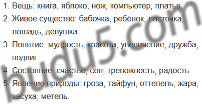 Распределите существительные на группы в зависимости от того, что они обозначают: 1) вещь; 2) живое существо; 3) понятие; 4) состояние; 5) явление природы.