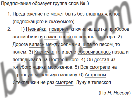1) Незнайка ключик на щитке приборов автомобиля и ногой на педаль стартёра. 2) Вилась между холмами, шла то лесом, то полем. 3) Кнопочка то и дело оборачивалась назад и поглядывала на Пёстренького. 4) Он из голубого ящика мороженое. 5) Странную маленькую машину. 6) Астроном Стекляшкин не раз Луну в телескоп.