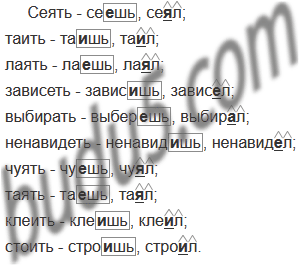 Сеять, таить, лаять, зависеть, выбирать, ненавидеть, чуять, таять, клеить, стоить.