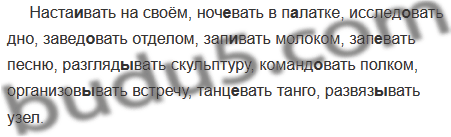 Наста..вать на своём, ноч..вать в п..латке, исслед..вать дно, завед..вать отделом, зап..вать молоком, зап..вать песню, разгляд..вать скульптуру, команд..вать полком, организов..вать встречу, танц..вать танго, развяз..вать узел.