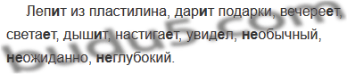 Леп..т из пластилина, дар..т подарки, вечере..т, света..т, дыш..т, настига..т, увид..л, (не)обычный, (не)ожиданно, (не)глубокий.