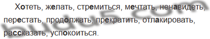 Х..теть, ж..лать, стр..миться, м..чтать, нен..видеть, пер..стать, прод..лжать, пр..кратить, отл..кировать, ра(с, сс)казать, усп..коиться.