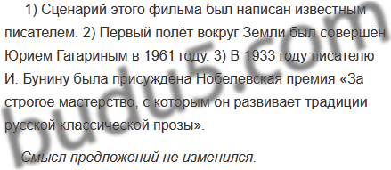 1) Сценарий этого фильма написал известный писатель. 2) Первый полёт вокруг Земли совершил Юрий Гагарин в 1961 году. 3) В 1933 году писателю И. Бунину присудили Нобелевскую премию «За строгое мастерство, с которым он развивает традиции русской классической прозы».