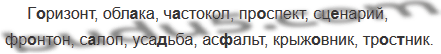 Г..ризонт, обл..ка, ч..стокол, пр..спект, сц..нарий, фр..нтон, с..лоп, уса..ьба, ас..альт, крыж..вник, тр..с..ник.
