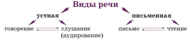 Слова говорение — слушание, письмо — чтение соединены двойными стрелками, потому что эти виды общения взаимосвязаны и адресованы другим людям. Они взаимосвязаны: мы слушаем, потом отвечаем, или читаем то, что написано.