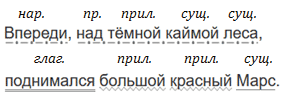 1) Впереди среди света и теней то садясь на задние лапки и поднимая торчком3 уши то делая короткие прыжки двигался заяц проб..раясь на золотую поляну. 2) На западе за селом светало3. На востоке на (сизо)пыльной туче над хлебами стояли две (зелёно)фиолетовые дуги. 3) Ветер гнал всё порывистее2 сыпля брызги с (ярко)зелёных деревьев. За садом где(то) низко гремел тугой гром. 4) Малиновое без лучей солнце село за огромным кругом в сизую сухую муть за рекой за полями уже покрытыми звеньями копён. 5) Против дверей у стены стоял комод крытый вяз..ной скатертью.5 6) (C)пpaв.. было чуть белеющее в сумраке поле покрытое копнами.4 (С)лева с тускло чернеющих пашен с р..внины дул тёплый ветерок. Впереди над тёмной каймой леса подн..мался большой красный Марс.4