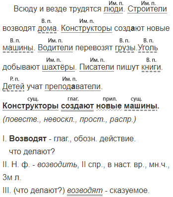 Всюду и везде трудят(?)ся люди. Строители возводят3 дома. Конструкторы созд..ют новые машины.4 Водители перевозят грузы. Уголь добывают шахтёры. Писатели пишут книги. Детей учат препод..ватели.