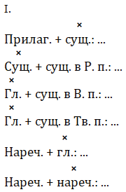 Красивое платье, синий жакет, пиджак брата, портфель отца, смотреть телефильм, читать роман, рубить топором, писать карандашом, быстро бежать, хорошо плавать, плавить металл, песня строителей, по-осеннему пасмурно, блестящий успех, рисовать красками, гнездо орла, сердито ворчать, очень темно.